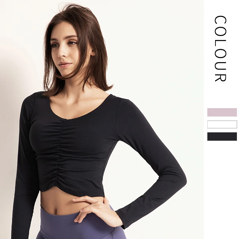 Autumn & Winter Round Neck Yoga Shirts with Chest Cushion Sexy Tight Navel Exposed Running Fitness
